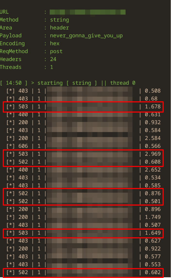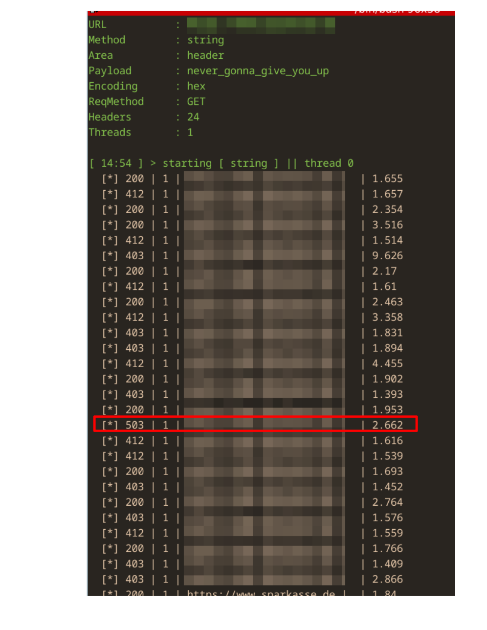 - during attack-preparation we could measure a significant timedelay when we enforced errors on the WAF (503), resulting in roughly twice the requesttime than with all other requests, leading to the conclusion, that this particular request is kind of "more expensive" on the WAF, a good indicator for a usable attackvector. Later on in the real attackscemario we simply deep-fried the WAF