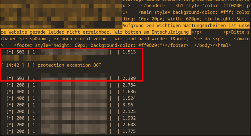 the following output shows Target 1 with GET/POST-request, protectecd by a WAF with forced errors and Target 2, our own Testsite, not protected by a WAF, thus no HTTP Errors 403/401