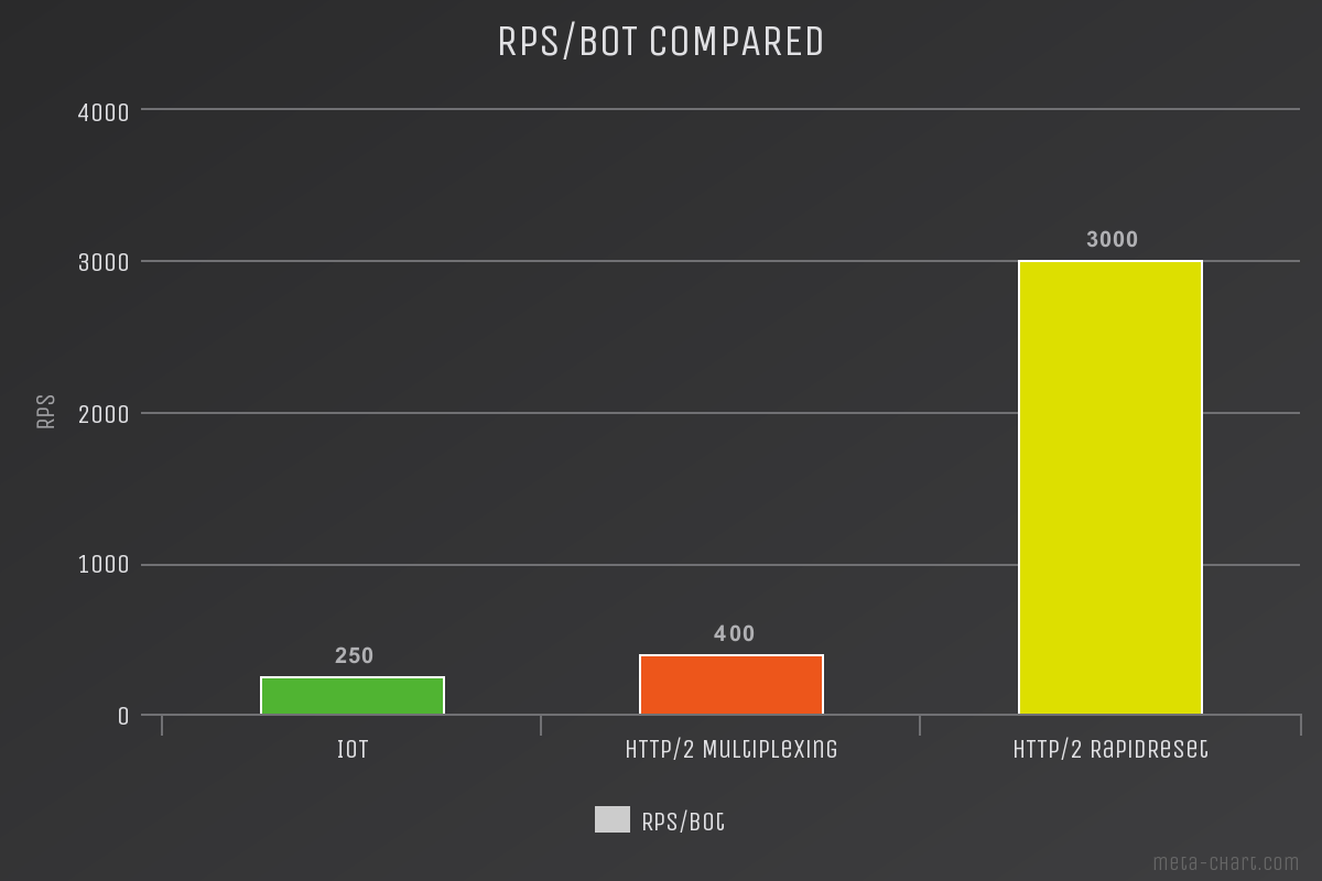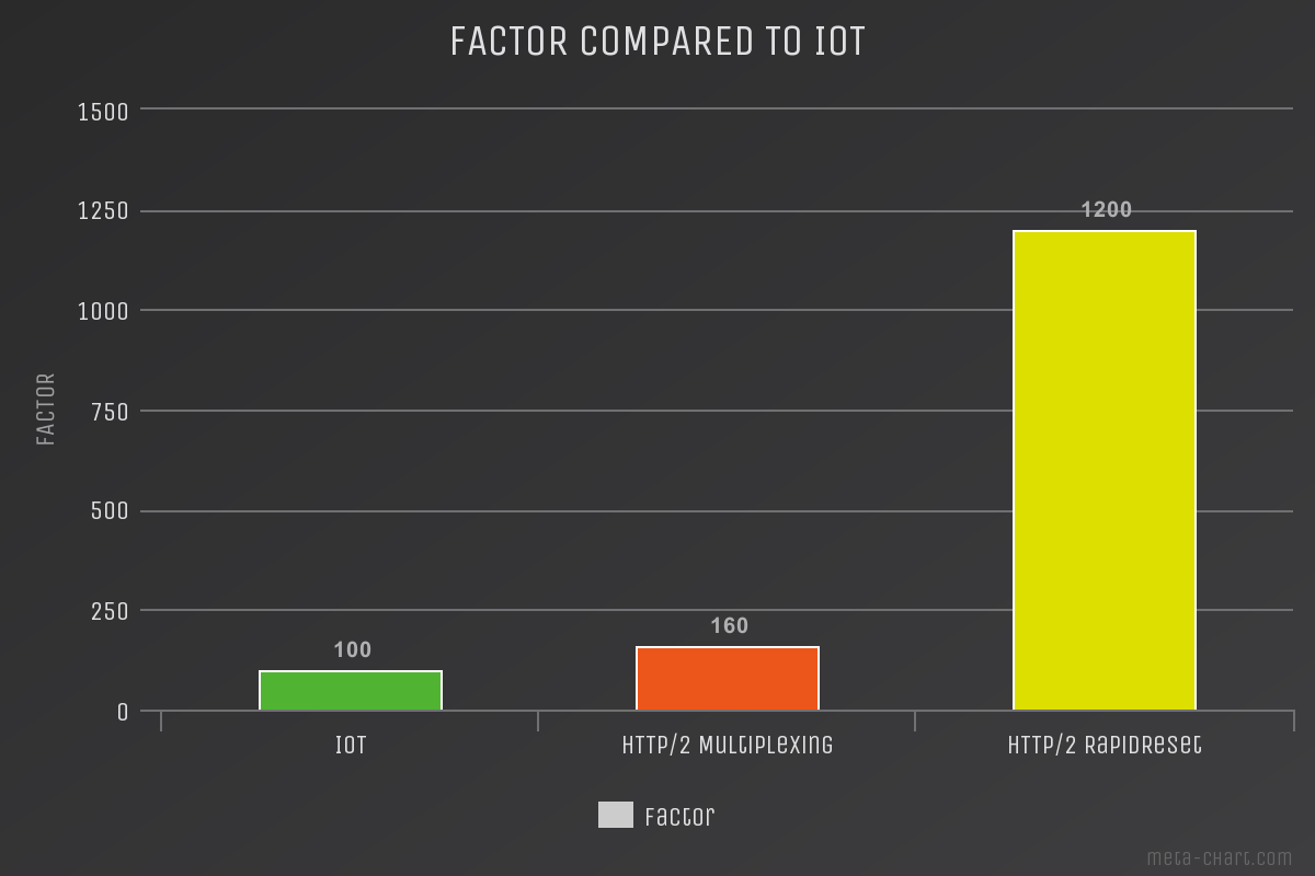 We measured the attack-potential of the new RapidReset-Attack vs established vectors and compared it to the Firepower (RPS, Requests/Second) of IoT - Bots. We used a small Botnet and our well beloved target, aka zeroBS Webserver. Ordered attackrate, threads etc has always been the same. As you can see in the charts below, the attackrate of HTTP/2 RapidReset is remarkable higher that HTTP/2 Multiplexing.