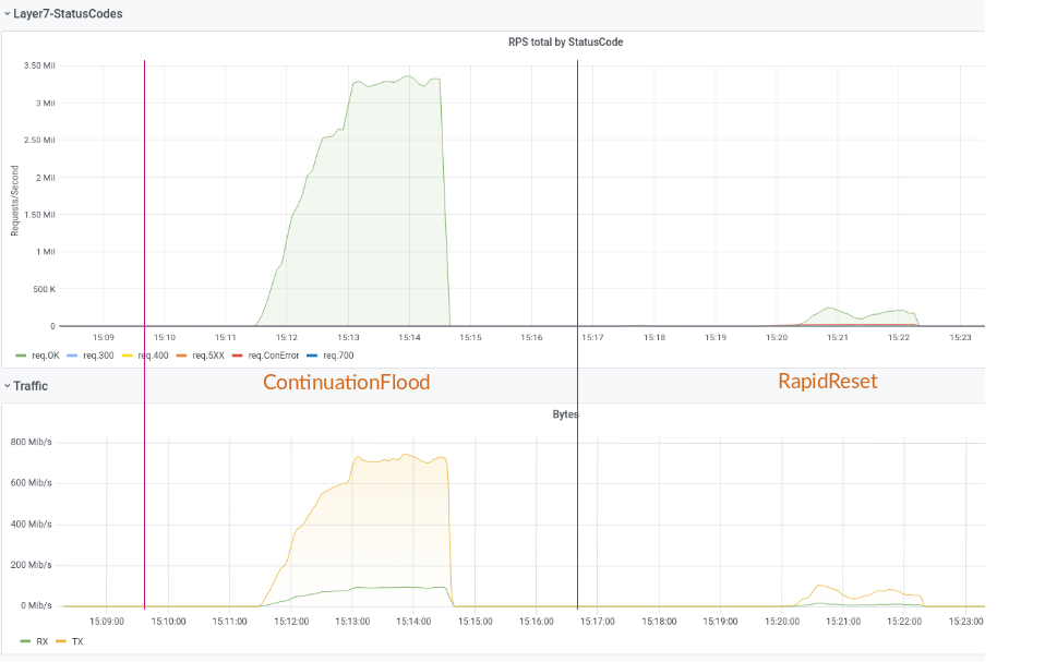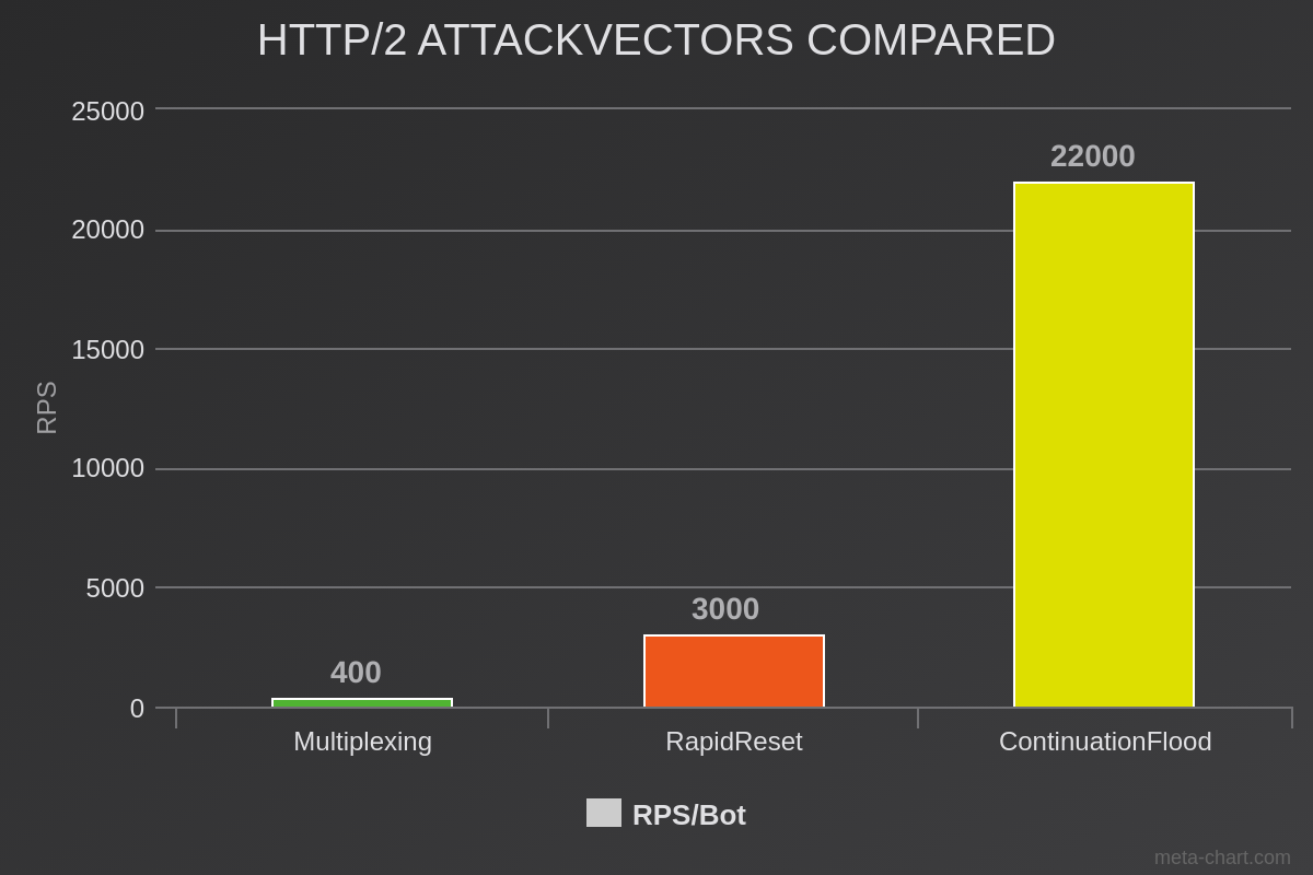 When we compare ContinuationFlood with RapidReset, the true potential comes to light: while RapidReset was almost 8 times as powerful compared to normal HTTP/2 Multiplexing attacks, ContinuationFlood is 7 times stronger than RapidReset in terms of pure Requests per Second (RPS) per bot.