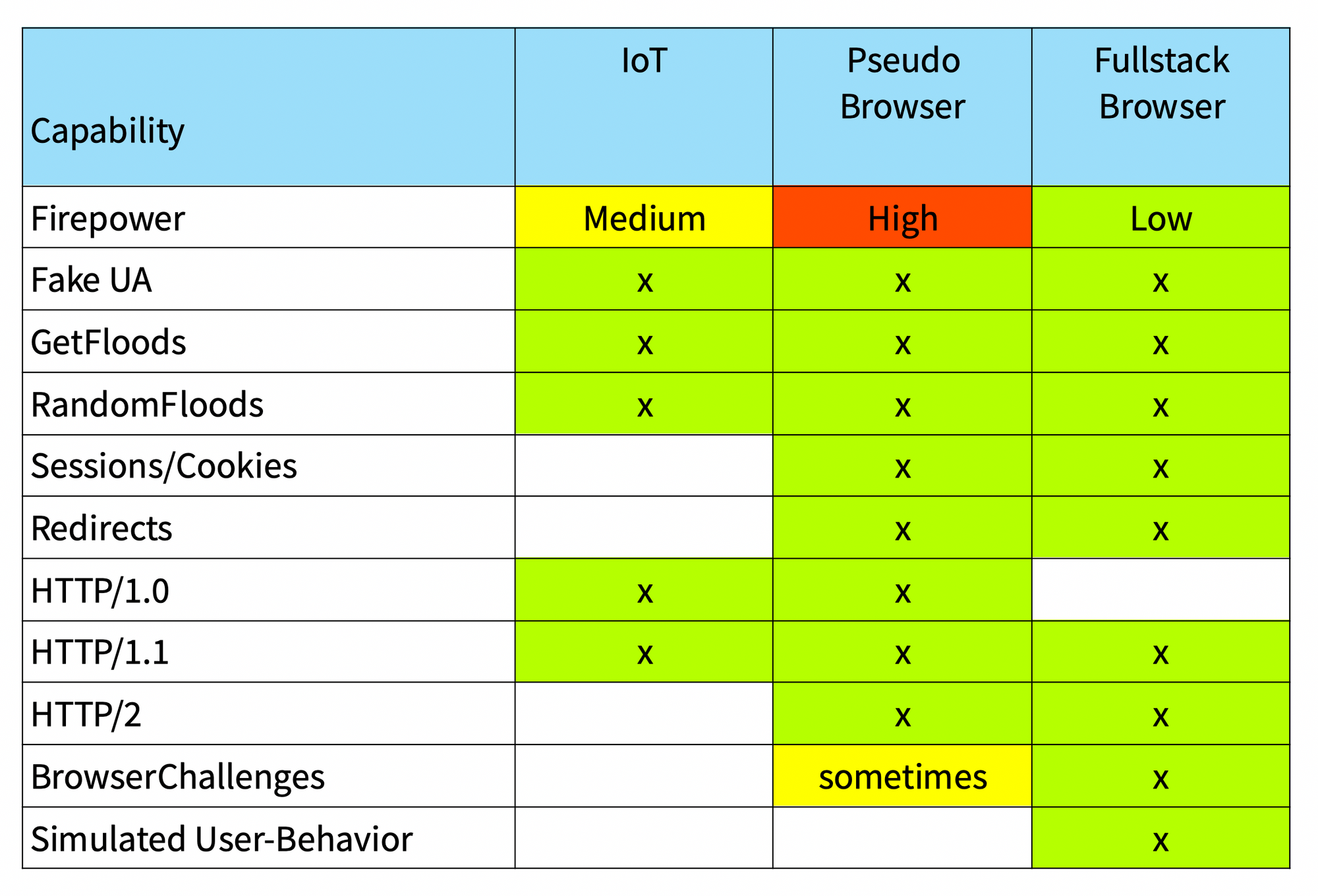 - Firepower: means Requests per Seconds, RPS. IoT is between 5-10 RPS, Pseudobrowsers up to 200 RPS, Browsers 1-5 RPS, all measured against an HTTPS-Target