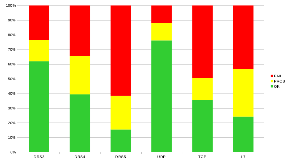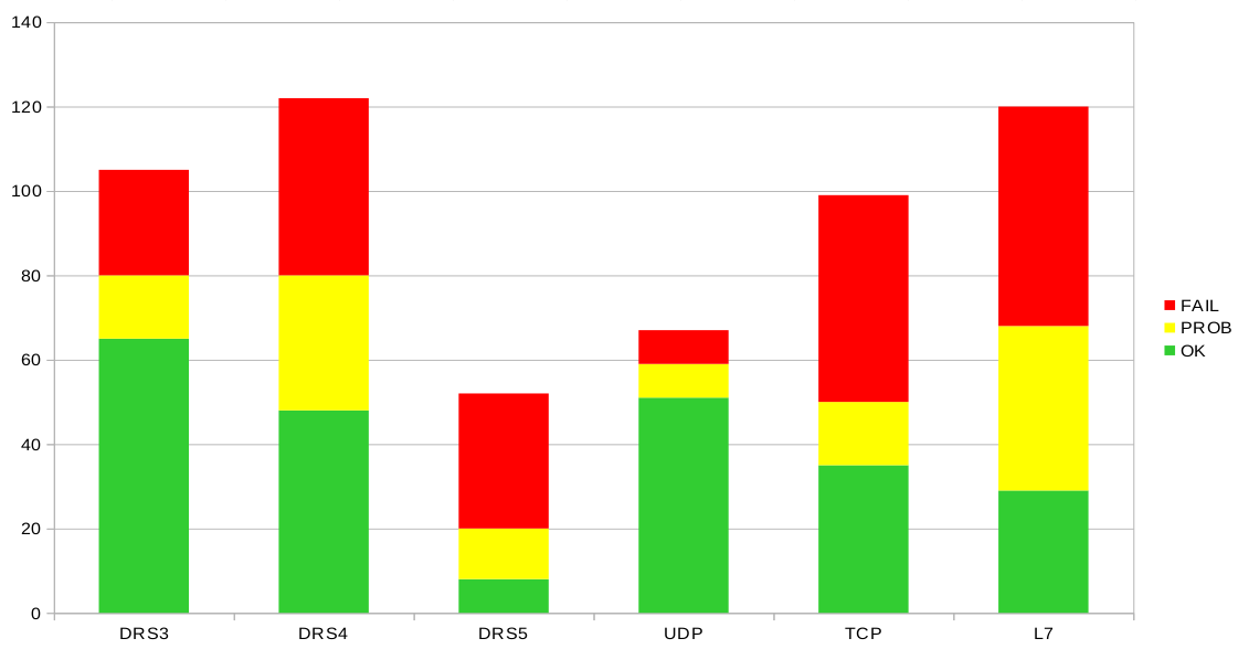 In this way, tests with the same vector and DRS level were combined and the worse result was evaluated. If we carried out 3 UDP tests according to DRS 3, two of them OK and one FAIL, then a FAIL went into the evaluation.