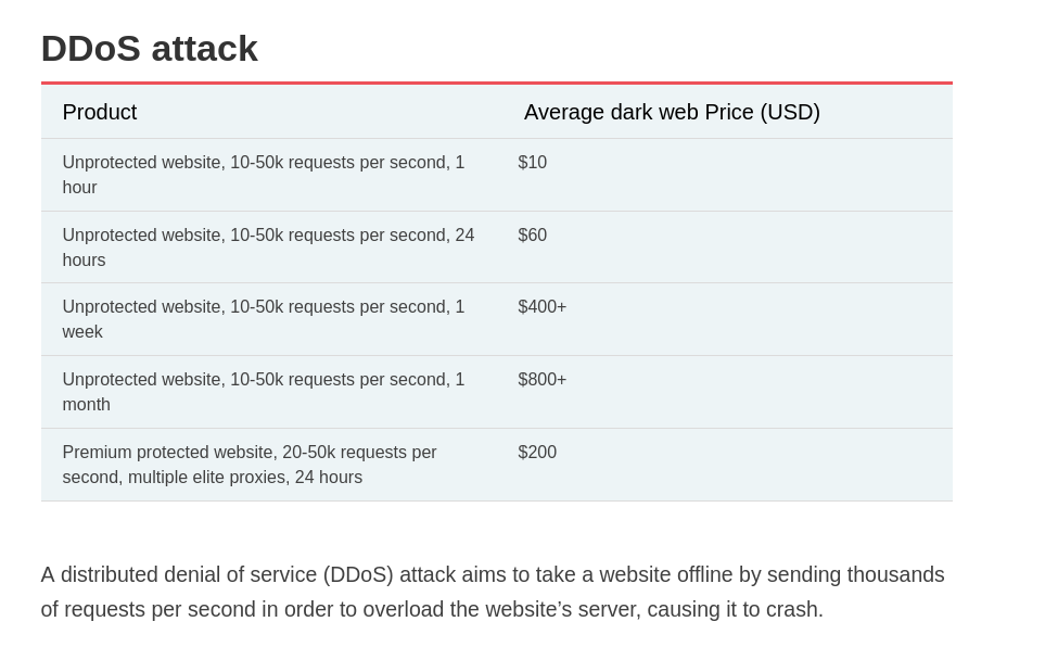 The average cost of a DDoS attack is $ 26 / hour. A botnet is commonly used in attacks. DDoS-as-a-Service has become a popular business model. Hackers charge an hourly or even monthly fee to sustain the attack as much as the customer wants. Some charge extra for DDoS-protected site attacks. src: securitylab.ru
