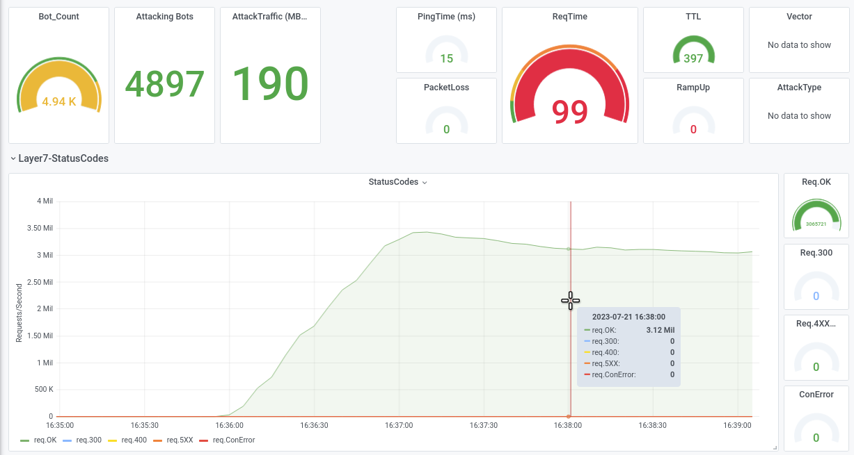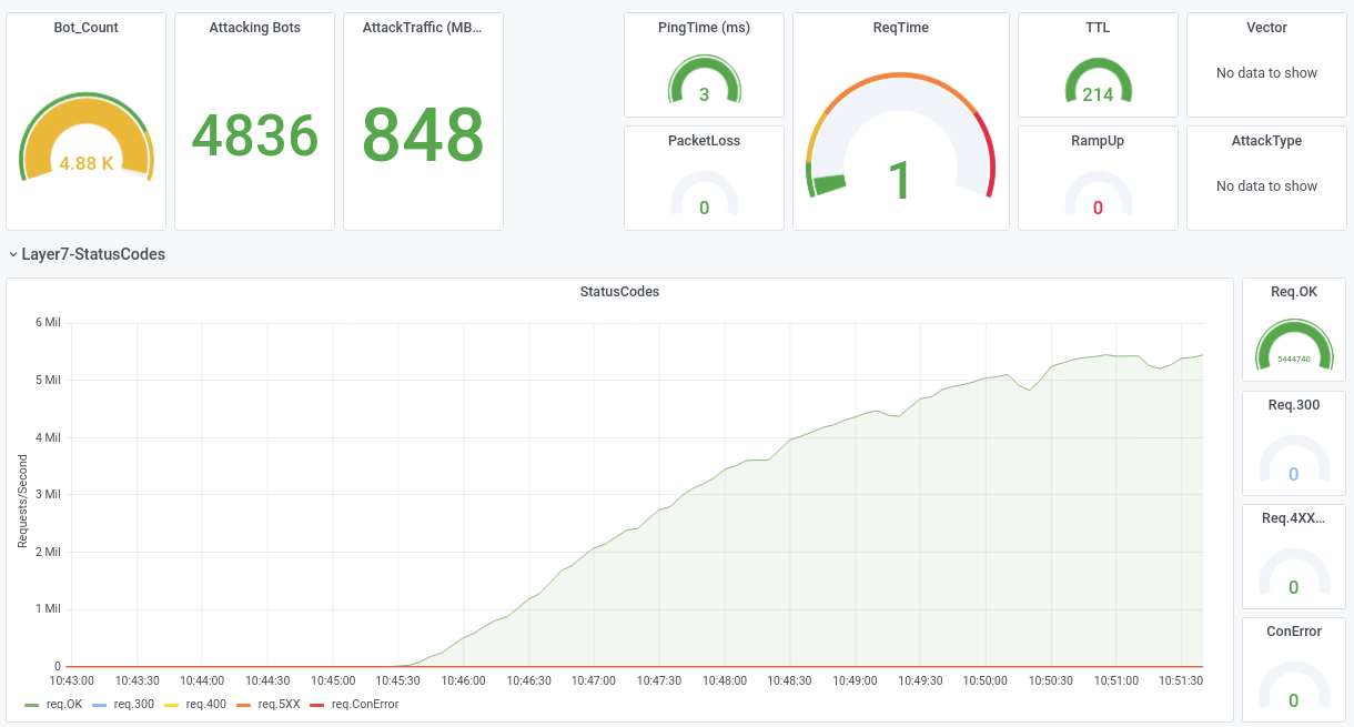 The next screenshot shows the same attack against Cloudflare, which is completely unimpressed despite 5 million open HTTP sessions.